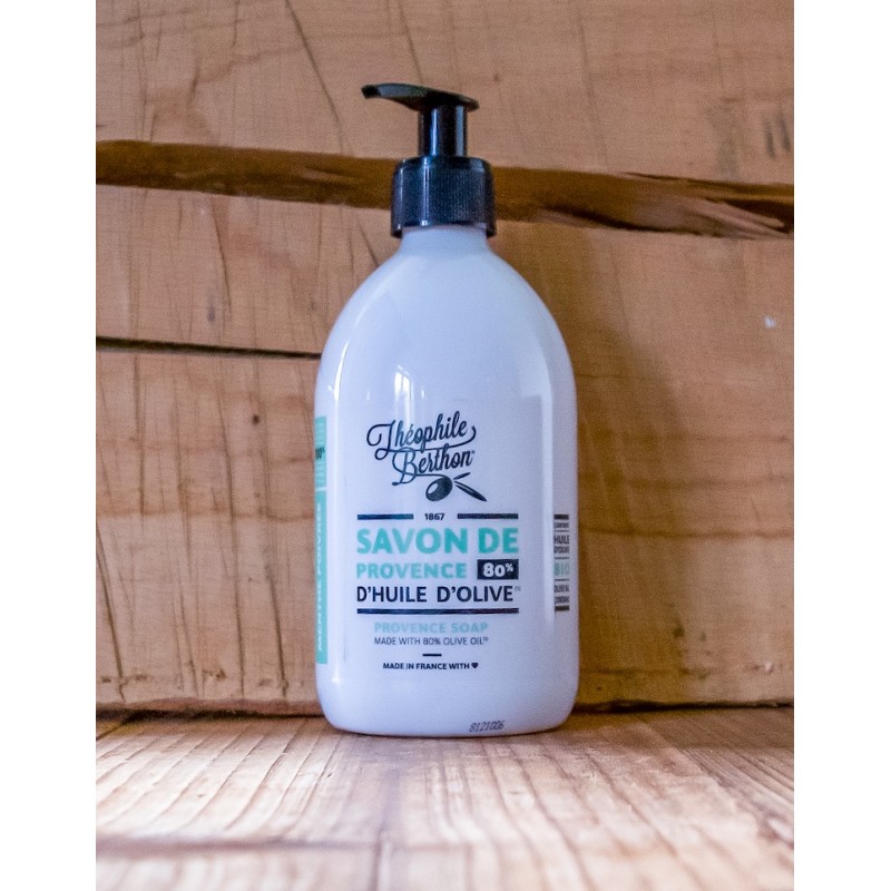Vloeibare Franse zeep van THEOPHILE BERTHON met de muntachtige geuren en essentiële olie van pepermunt.